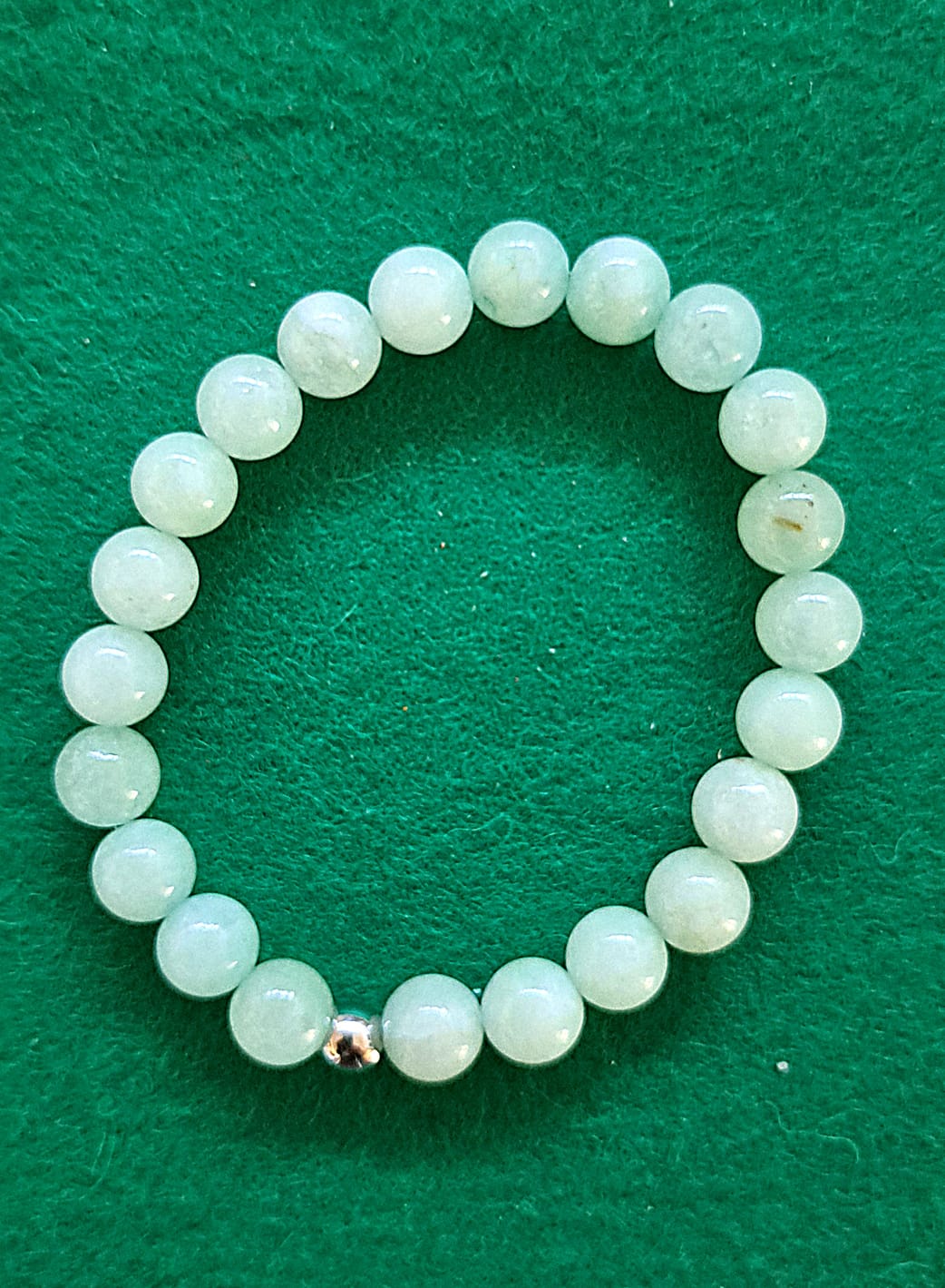 Náramok z polodrahokamov. Angelit 8mm, korálky z nehrdzavejúcej ocele, na pružnom lanku. Obvod 16 cm.