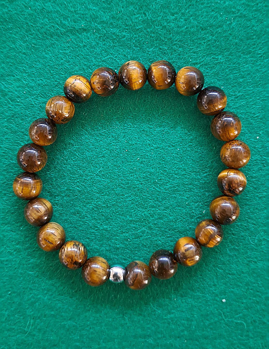 Náramok z polodrahokamov. Tigrie oko hnedé 8mm, koralky z nehrdzavejúcej ocele, na pružnom lanku. Obvod 16 cm.